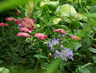 Achillea millefolium 'Heidi' mit einem Sämling von Campanula lactiflora.